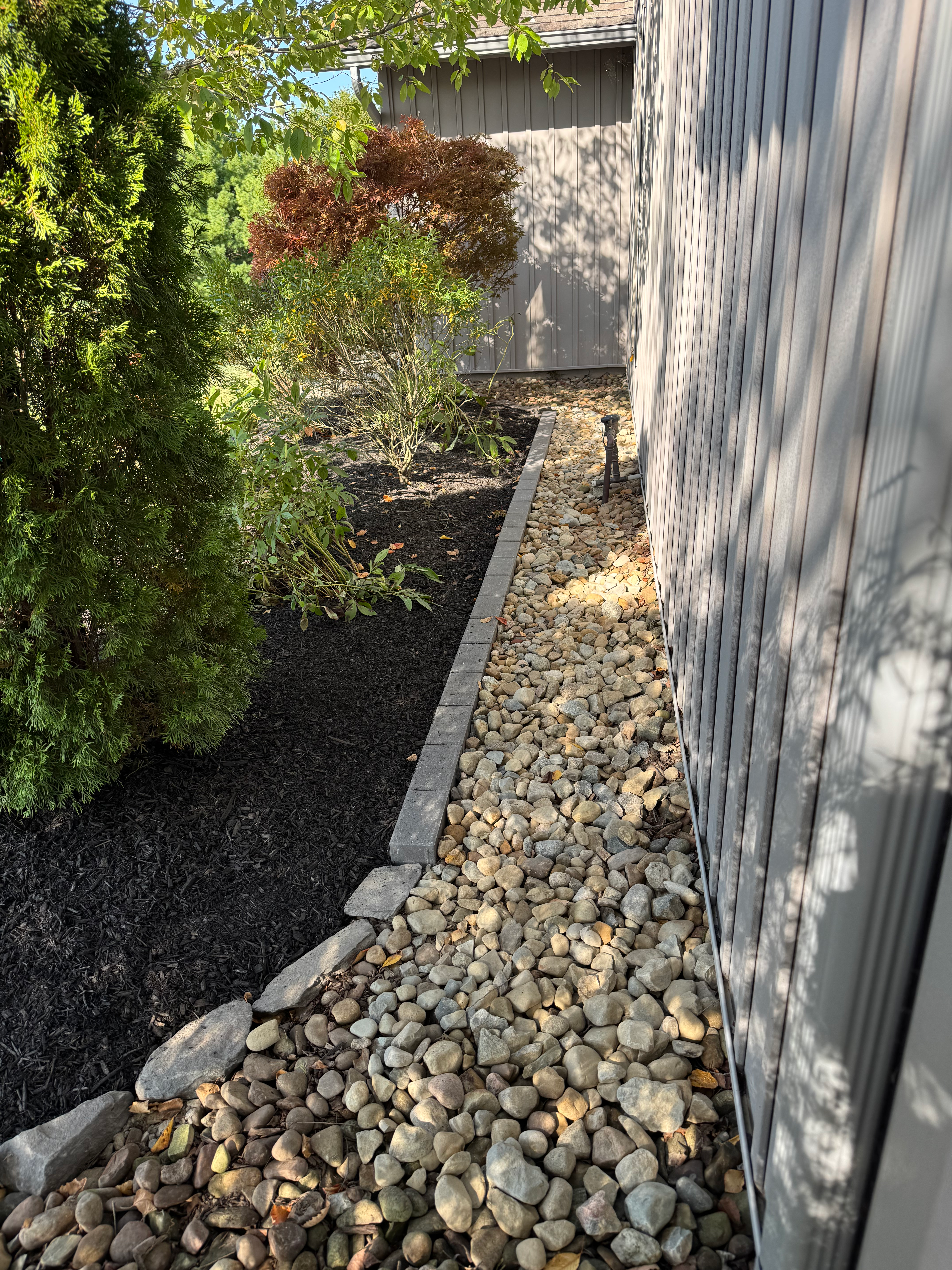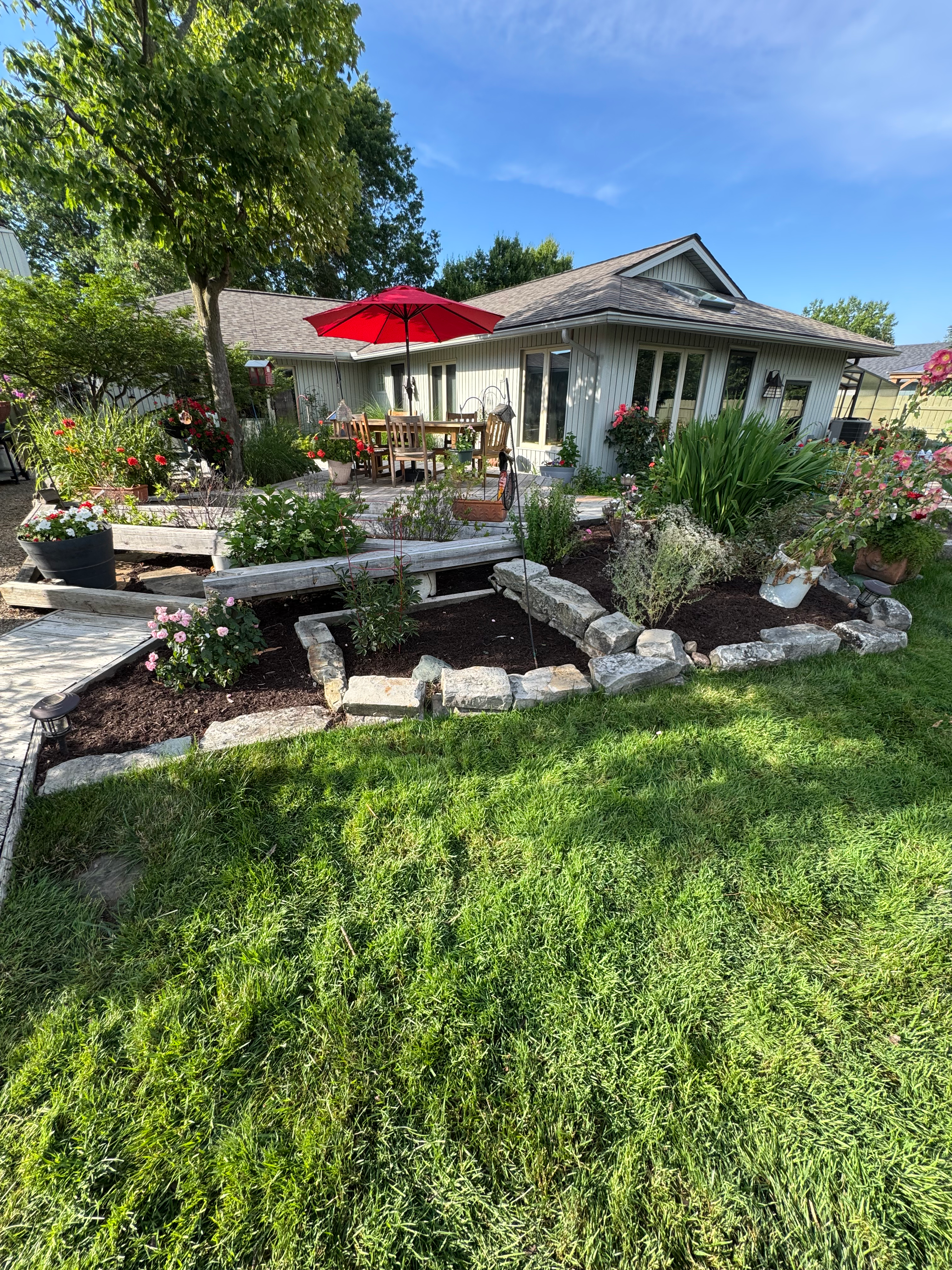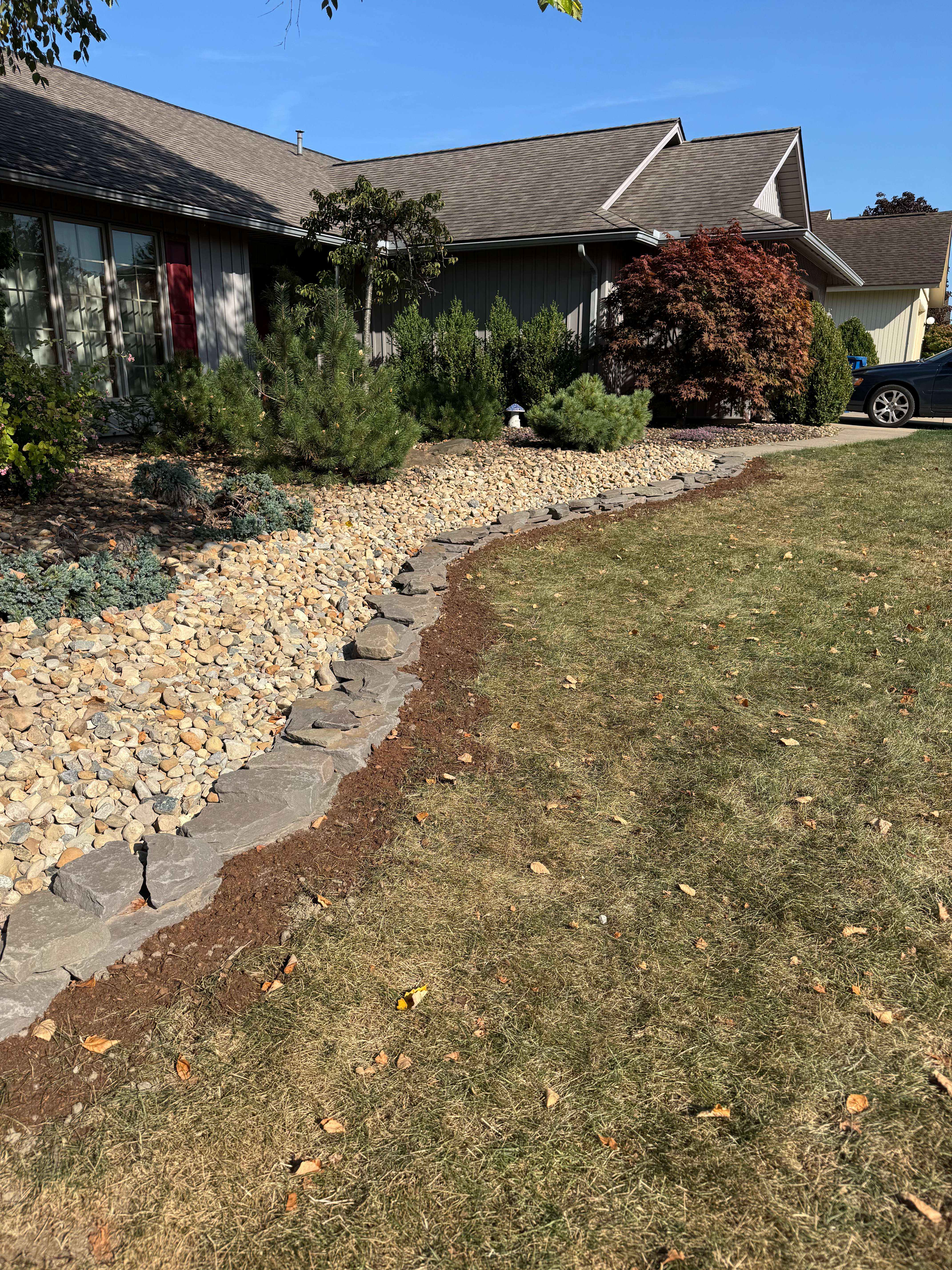 Completely transformed this yard with new brick edging, flagstone walls, fresh mulch beds, decorative rock beds, and custom picked plants!