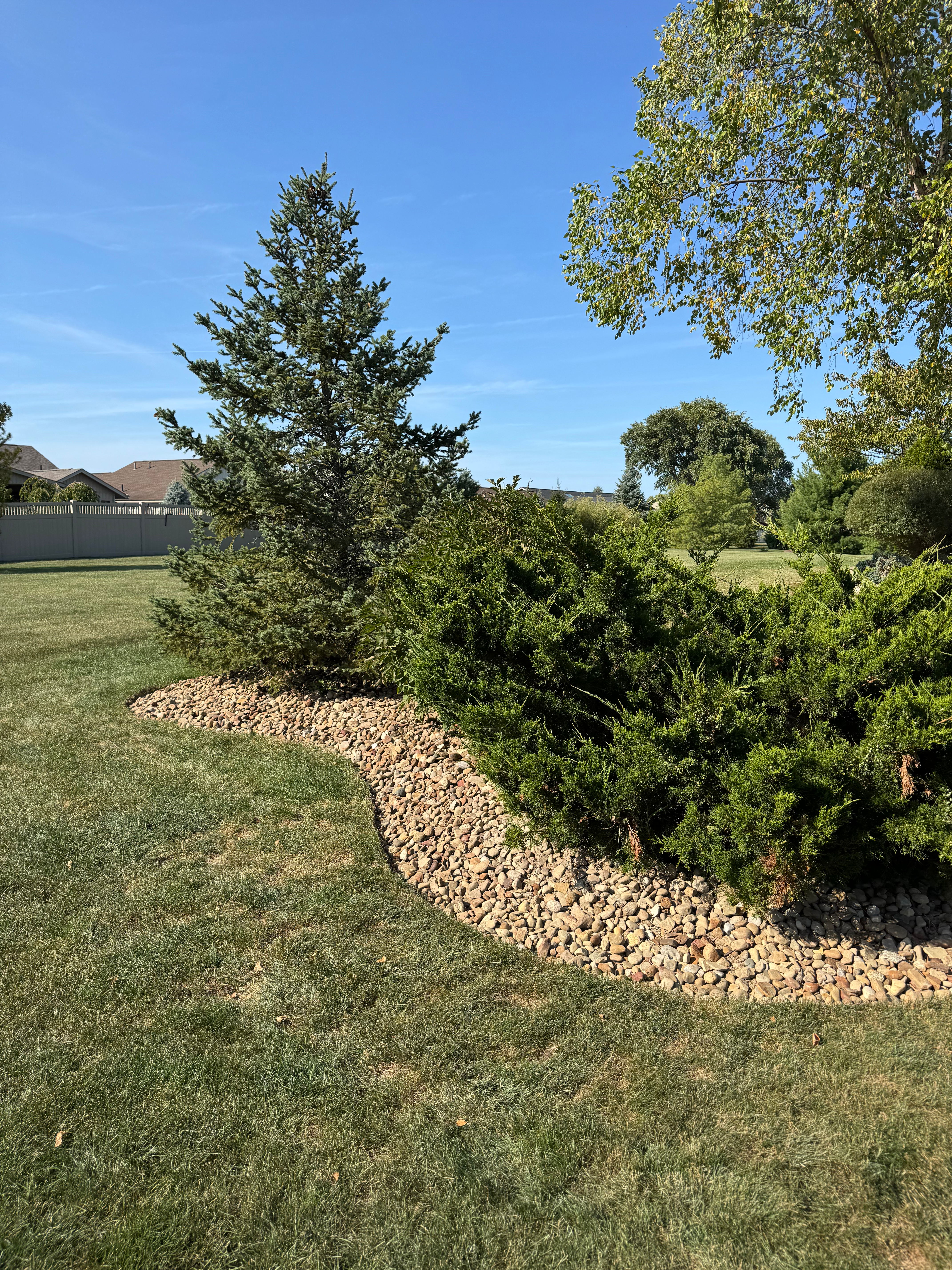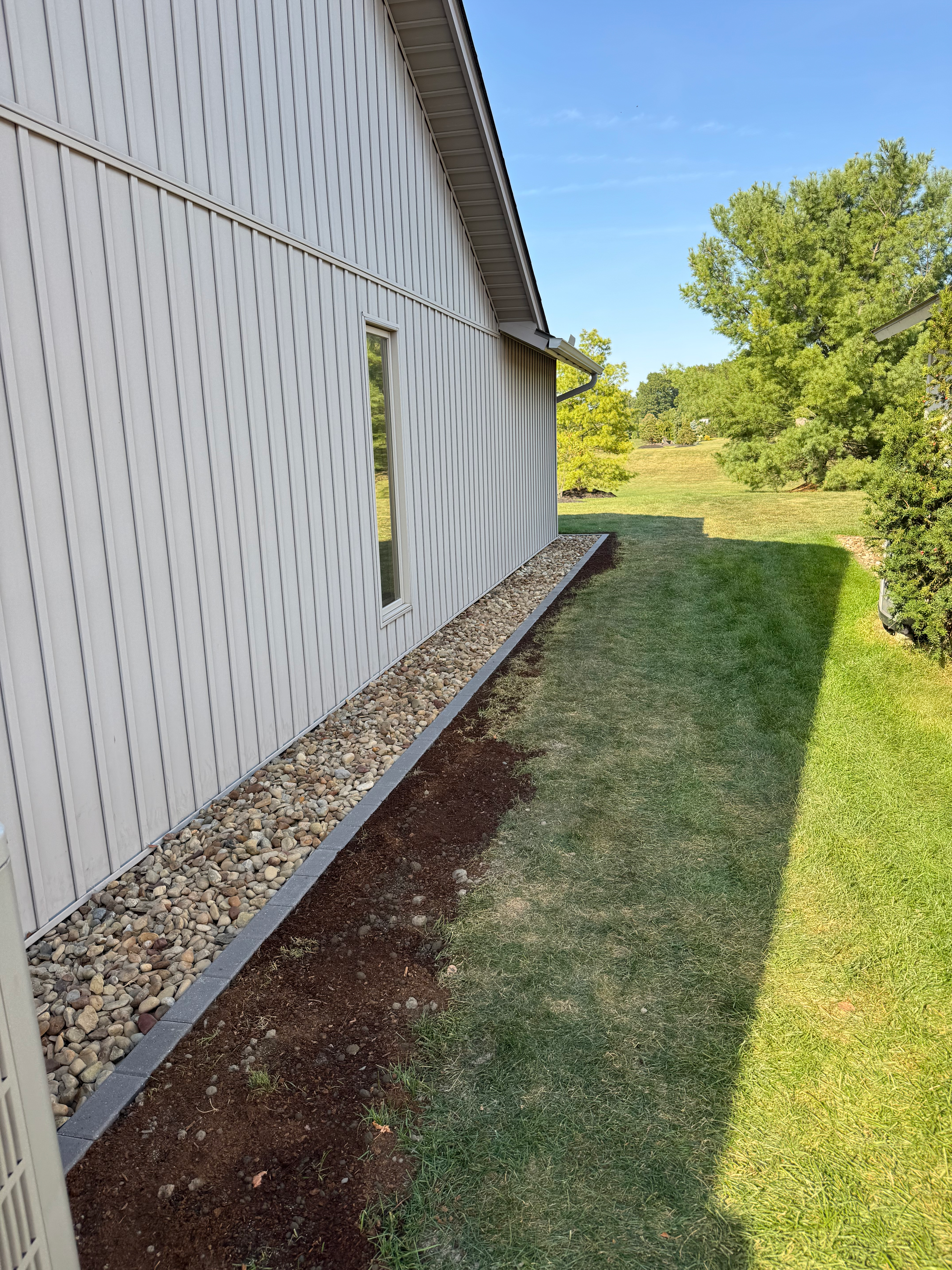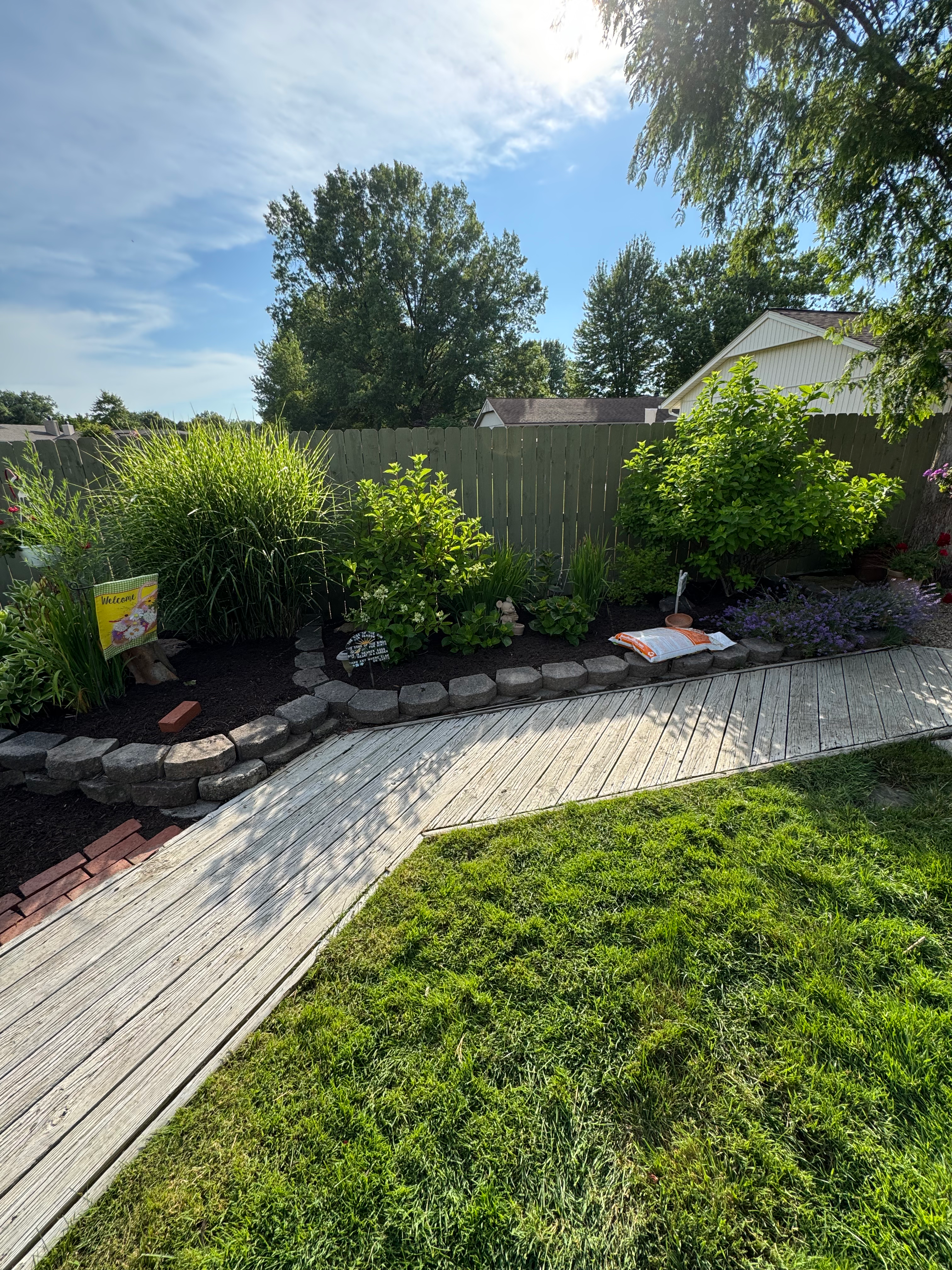 Completely transformed this yard with new brick edging, flagstone walls, fresh mulch beds, decorative rock beds, and custom picked plants!